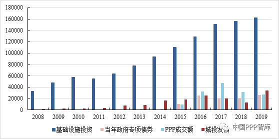 图5 2008~2019年中国基础设施投资与专项债、PPP、城投债概览